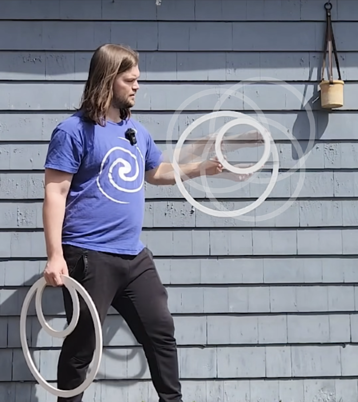 Poi spinning, a pair of tethered weighted balls, and Buugeng manipulation, a pair of S-shaped props, became his next endeavors over another six years. His experience in handling props became a natural foundation when he took on 8-ring manipulation, which he learned from Polish performer Shao [@shao.pl]. He seemed to have a natural knack for each discipline, but not without endless hours of practice to perfect his developing vision of each art form. At the learning core is a strong connection with prop manipulation and shape isolation that transforms simple geometric shapes into art.